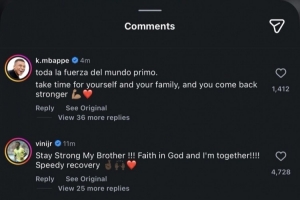 罗德里戈遭遇重伤,姆巴佩、维尼修斯社媒留言鼓励