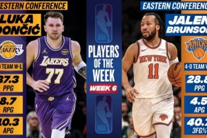 体育资讯12月2日讯 今日NBA官方宣布,湖人球星东契奇与尼克斯球星布伦森分别当选NBA上周西部和东部周最佳球员。