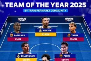 德转票选2025年度最佳阵:姆巴佩、亚马尔、贝林厄姆、佩德里在列