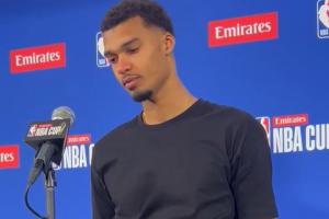 赛后发布会,文班接受采访,第一个问题他眼眶泛红全是泪水,用哭腔说着:“对不起,我今天失去了一位亲近的人(I'm sorry, I lost somebody today)。”