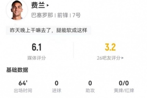 体育资讯1月4日讯 巴萨在本轮西甲对阵西班牙人,费兰本场数据如下: