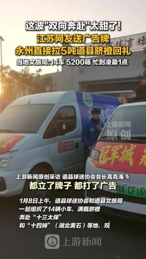 这波“双向奔赴”太甜了!江苏网友送广告牌,永州直接拉5吨道县脐橙回礼,当地文旅局:14车,5200箱,忙到凌晨1点。