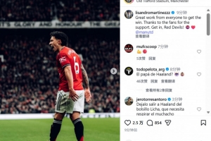 本场比赛利桑德罗发挥出色,限制了哈兰德的表现。利桑德罗赛后在社媒晒出本场庆祝照,配文写道:“每一个人都表现出色,这让我们收获胜利。感谢球迷的支持,红魔加油!”