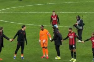米兰球员手拉手跑到一半停下,落在最后的萨勒马科尔斯腿上绑着冰袋,他一瘸一拐的赶上来还跳到了迈尼昂的背上。