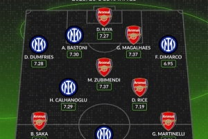 前锋:萨卡(阿森纳,7.26分)、劳塔罗(国际米兰,7.67分)、马丁内利(阿森纳,7.79分)