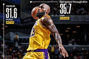 老詹今日对阵篮网暴扣垂直起跳80.3厘米&滑行2.9米 球过筐时速57.5公里(16.7米每秒)
