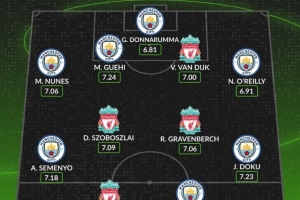 后卫:努内斯(曼城)、格伊(曼城)、范戴克(利物浦)、奥赖利(曼城)