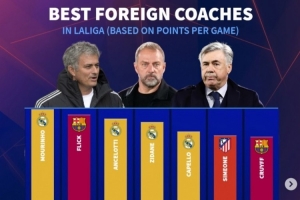 体育资讯2月21日讯 《转会市场》统计了西甲历史至少执教50场的外籍主帅场均拿分情况,穆帅依然领跑。