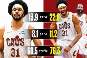 有哈登时,阿伦场均22.6分11.2篮板,投篮命中率76.3%,真实命中率76.8%。