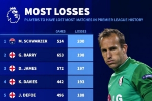 英超历史输球场次榜:施瓦泽200场最多、普劳斯175场第10
