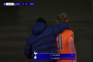 体育资讯03月11日讯 热刺vs马竞,热刺开场连丢三球,教练直接把门将金斯基换下。下场后金斯基直接进了通道,球队的工作人员赶上去安慰他。