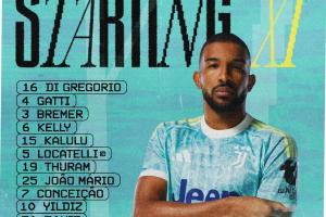 尤文首发:16-迪格雷戈里奥、3-布雷默、4-加蒂、6-凯利、15-卡卢卢、25-马里奥、5-洛卡特利、19-凯夫伦-图拉姆、7-小孔塞桑、10-伊尔迪兹、30-乔纳斯-戴维