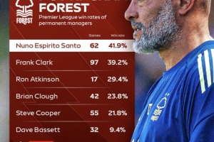 体育资讯9月9日讯 诺丁汉森林官宣努诺下课,根据数据统计努诺是森林队史英超胜率最高的主帅。