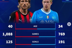 体育资讯9月28日讯 本轮意甲AC米兰将迎战那不勒斯,德转也对比两队中场莫德里奇与德布劳内生涯数据,具体如下: