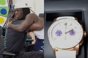 詹姆斯首先赠予Kai Cenat的一只价值20万美元的爱彼手表,随后又向全体直播团队成员每人赠送了一双个人第23代签名战靴Nike LeBron 23。