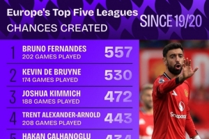 体育资讯10月10日讯 据Squawka统计,2019-2020赛季以来,B费创造557次机会,五大联赛同期最多。