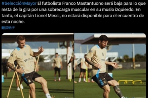 阿根廷官方写道:“球员马斯坦托诺的左大腿肌肉过度疲劳,将缺席接下来的巡回比赛。与此同时,队长梅西也将缺席今晚的比赛。”