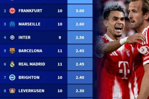 体育资讯10月21日讯 德转盘点了本赛季五大联赛球队目前场均进球最多榜单(各项赛事),其中拜仁高居榜首,具体如下: