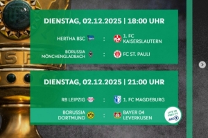 体育资讯11月6日讯 德国杯1/8决赛各场开球时间公布,12月3日4点勒沃库森vs多特蒙德,4日3点45柏林联合vs拜仁。