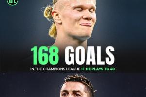 根据AI预测,如果哈兰德能够一直参加欧冠赛事,他在40岁时的欧冠进球数将达到168粒,成为欧冠历史射手榜第一。目前欧冠历史射手王是C罗,他在183场欧冠比赛中打进了140球。